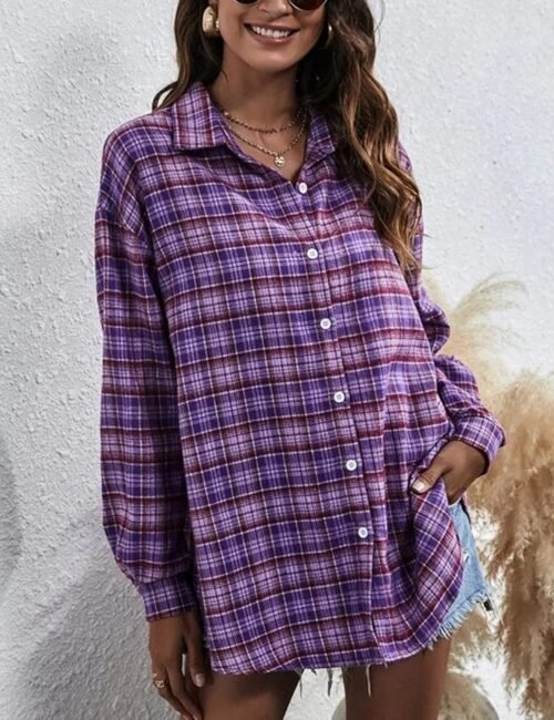 Casual long sleeve plaid shirts, lapel collar, single button cuffs, curved hem, drop shoulder, comfy baggy oversized flannel shirts for women