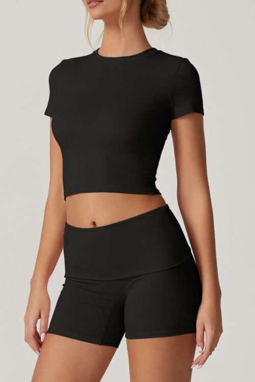 Women’s 2 Piece Outfits Lounge Sets Slim Fitted Short Sleeve Crop Tops Fold Over Shorts Casual Comfy Trasuits