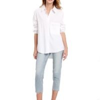这款衬衫采用长袖设计,袖口毛边,单纽扣,衬衫领,高低下摆,左胸有一个口袋。