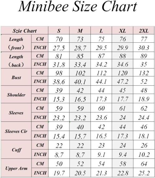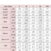 XL 码:长度:31.9-35.8 英寸,胸围:48.8 英寸,肩宽:17.1 英寸,袖长:24 英寸,袖周长:22 英寸,袖口:9.4 英寸