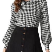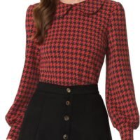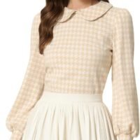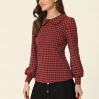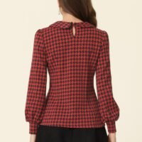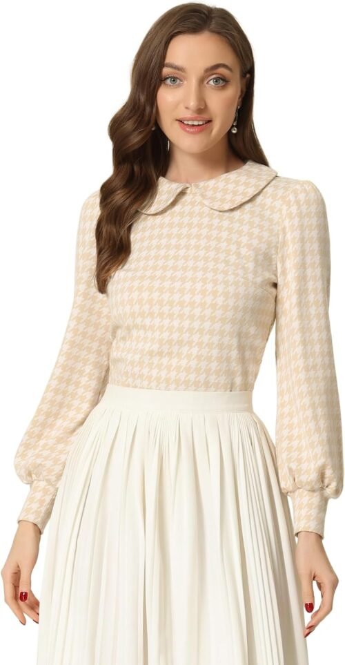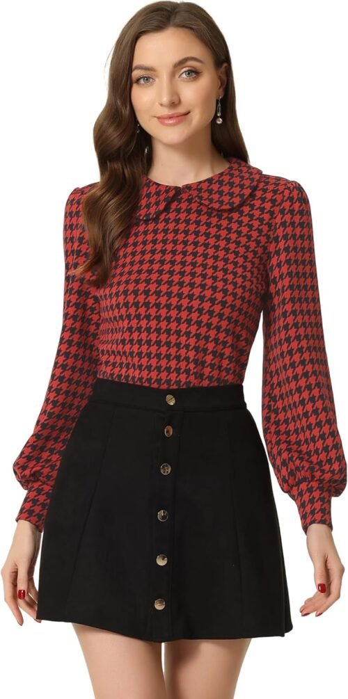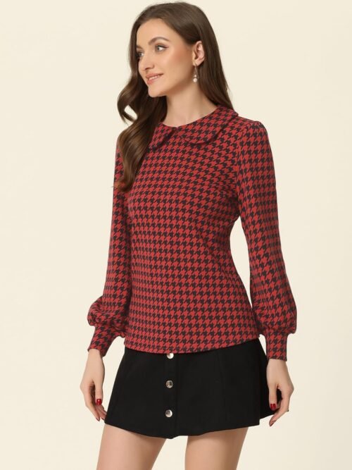 Women’s Peter Pan Collar Shirt Fashion Puff Long Sleeve Houndstooth Plaid Blouse